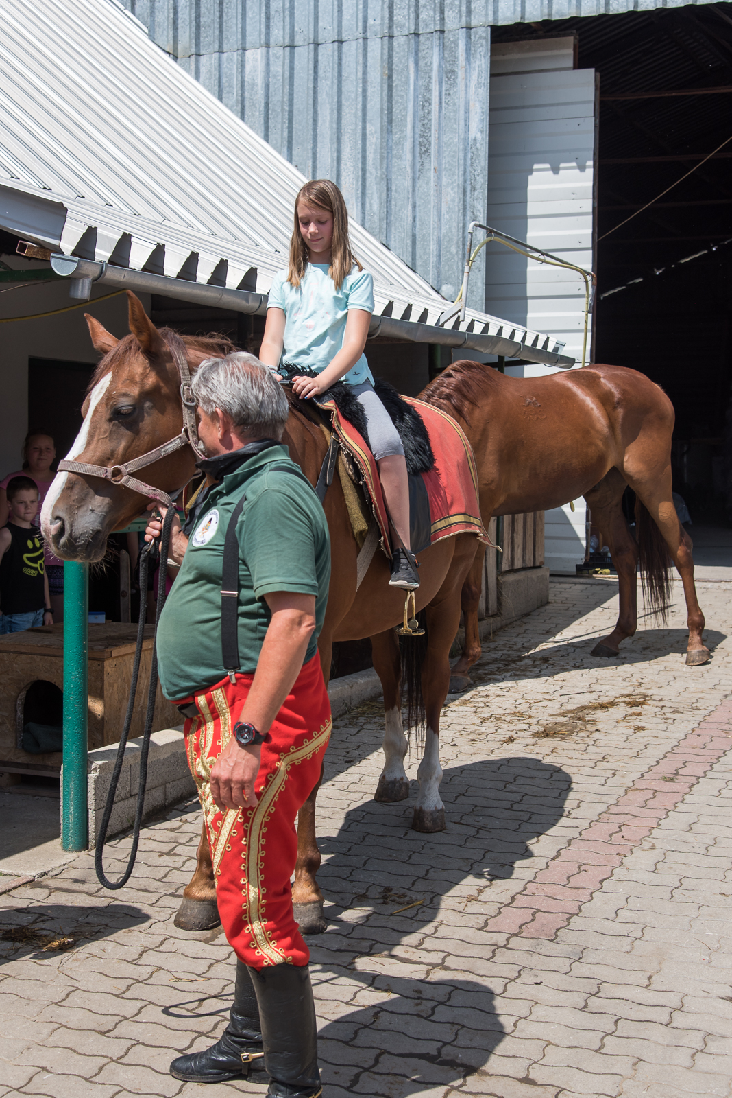 Az ízletes, bőséges béd után egy huszáros délután következett. A korábban fotókon látott hagyományőrző huszár – Ézsiás Vencel fogadta a csoportot. Az élő történelmi foglalkozáson beszélt a katonai hagyományőrzésről, korabeli életmódról, viseletről, fegyverekről, a huszár lováról, lótartásról. Bemutatásra került a gyermekek nagy örömére jó néhány „huszáros próbatétel”, ügyességi játék s vetélkedőre is sor került. A vállalkozó személyek még lóra is ülhettek, persze előtte a lóápolás, gondozás, etetés mesterségével is megismerkedtek. A huszáros délutánon élvezetes, bőséges információt kaptunk – így biztosan lesz a hagyományőrzőknél utánpótlás. Visszasétálva - némi vers és ének kíséretében, amit a kicsikkel gyakoroltunk, hátha hűsítőbb lenne a délután – a főhadiszálláson elkészültek a napi eseményekről a rajzos beszámolók, mindenki megrajzolta a maga vászonzsákját, átvette a várostörténeti füzetet, a Kozma-part emlékei kiadványt, a múzeumok ismertetőit, kiadványait, Bútorforgató játékot, agyag edénykéjét, Egy tisztább jövőért és Egy zöldebb jövőért füzeteket, nyakpántot, a magyaros láthatósági mellényt. A forró délutánt egy fagylaltozással zártuk. A helyszín rendezése közben – búcsúzóul néhányaknál - sor került még egy kis arcfestésre is.